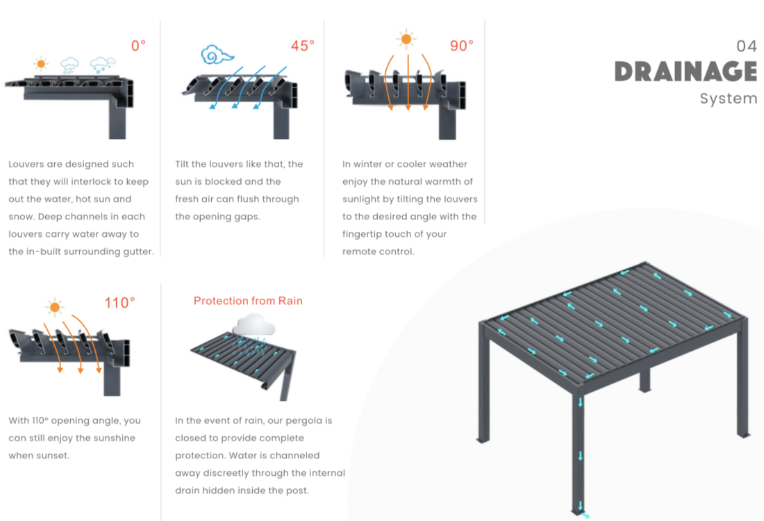 One of the standout features of the PERGOla is its adjustable louvre blades. With precision engineering, these louvres can rotate from 0 degrees (fully closed) to 110 degrees (fully open), allowing you to customize the amount of sunlight and ventilation you desire. Whether you seek a shaded retreat on a sunny day or an open sky view at night, the PERGOla provides the perfect solution.